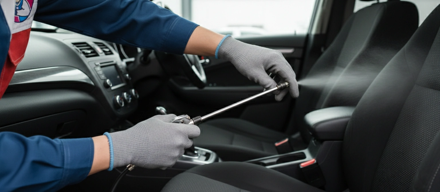Layanan pengasapan kabin menggunakan cairan disinfektan khusus yang diubah menjadi partikel uap halus untuk menjangkau seluruh sudut interior.